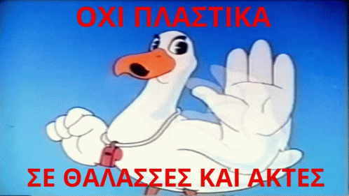 Cartoon pelican warns against plastics in seas and coasts, with Greek text 'Oxi Plastika'.