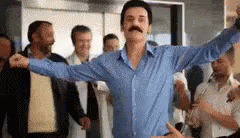A man with a mustache performs an energetic Oyun Havası dance at a celebration, surrounded by musicians and guests.