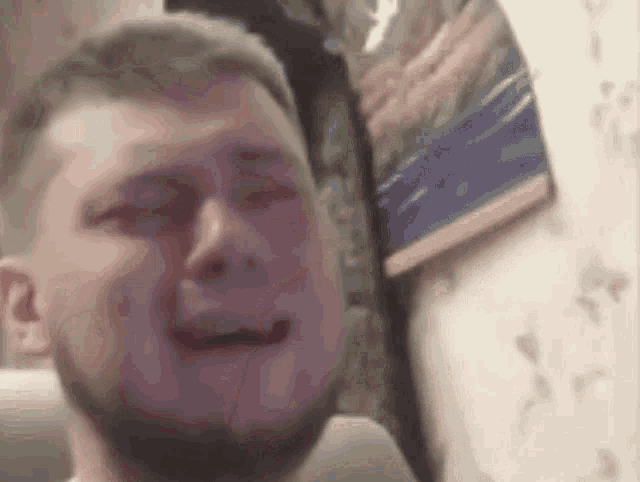 Ozon man with an intense, exaggerated crying and laughing expression, covering his face.