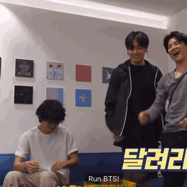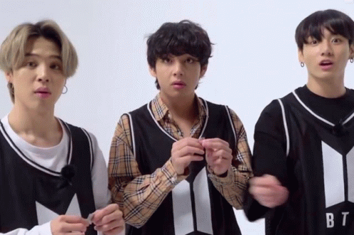 BTS members Jimin, V, and Jungkook react with surprise, overlaid with We Bare Bears characters mirroring their expressions.