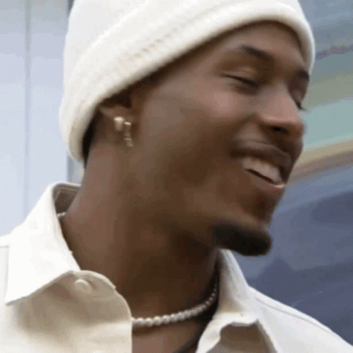 Paulo Andre, wearing a white beanie and pearl necklace, smiles with his eyes closed, then opens them.