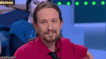 Spanish politician Pablo Iglesias laughs heartily, wearing a red shirt and black tie.