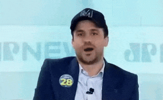 Pablo Marçal reacts with a smile and covers his mouth, wearing a cap with 'M' and a '28' badge.