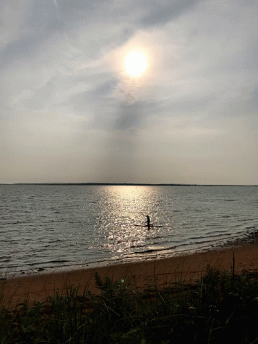 A person paddle boarding on a calm ocean under a bright sun, with golden reflections on the water.