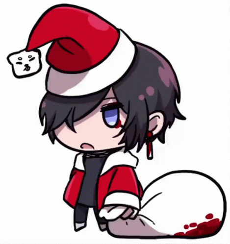 Chibi Padoru character in a Santa hat, carrying a white bag with a blood-like stain.