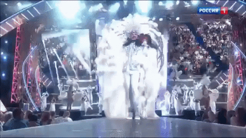 Filipp Kirkorov in an elaborate feathered costume, celebrating on stage with joy and triumph.