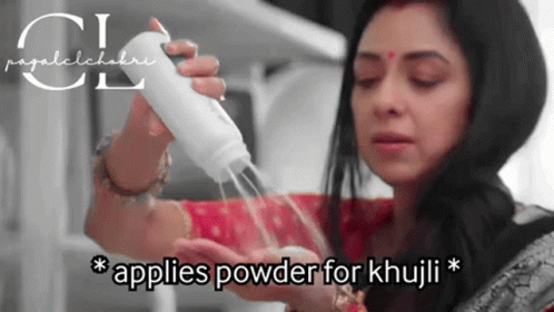 A woman applies powder to Anuj Kapadia for relief from itching, as indicated by the caption 'applies powder for khuji'.