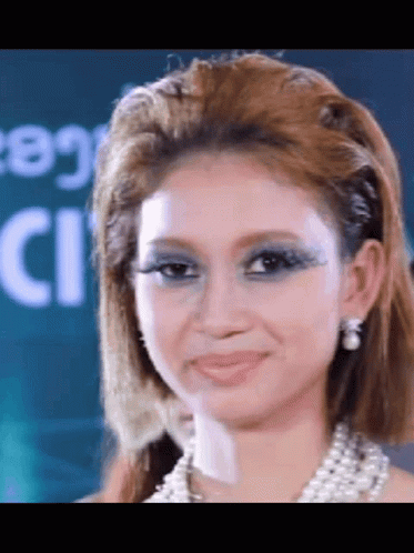 Beauty queen with dramatic eyelashes and blue eyeshadow at a pageant, wearing pearls, captioned 'Beauty alone is not enough'.