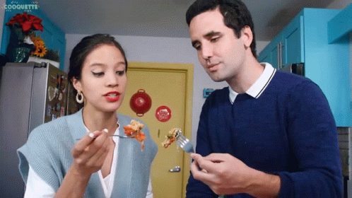 La Cooquette and partner enjoy a delicious meal in the kitchen, savoring every bite.