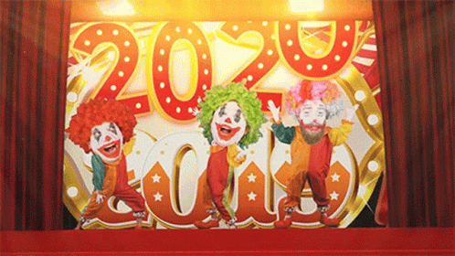 Three clowns dance on a stage in front of a '2020' sign, with one of the '0's comically falling.