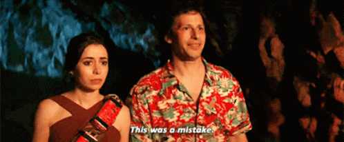 Andy Samberg as Nyles, alongside a woman, declares 'This was a mistake' in a moment of regret from Palm Springs.
