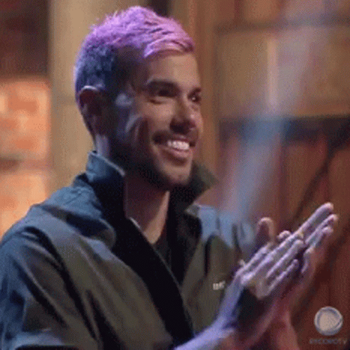 Man with purple hair smiling and clapping during A Fazenda, a Brazilian reality show.