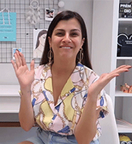 Nah Cardoso claps her hands happily while smiling at the camera.