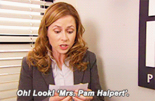 Pam Halpert reacts with excitement to seeing her married name, 'Mrs. Pam Halpert', on a document in The Office.