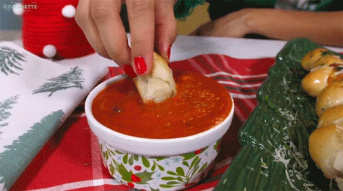 La Cooquette enjoys delicious Pan Relleno De Queso with Marinara Sauce in a festive Christmas kitchen.