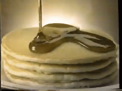 Syrup being poured over a stack of fluffy pancakes in a classic 80s commercial style.