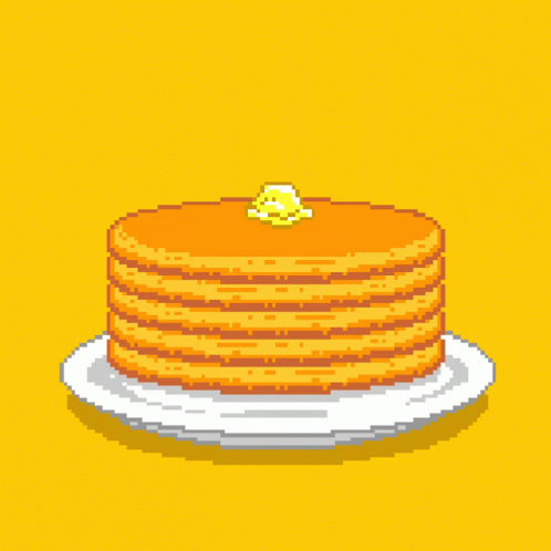 A stack of pixel art pancakes with a pat of butter on a white plate, perfect for breakfast.