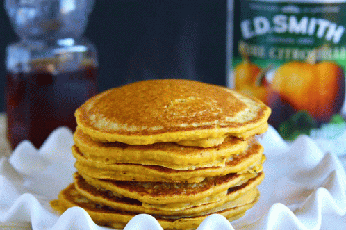 A delicious stack of golden pumpkin pancakes served on a white plate, ready for breakfast with syrup.