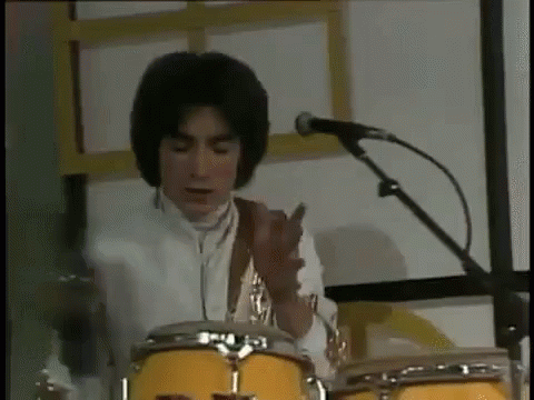 A member of the band Bukis energetically playing percussion on stage during a live performance.