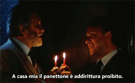 Two men in a dark room hold lit candles, discussing how panettone is forbidden in one's home.