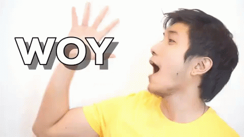 A man in a yellow shirt shouts 'Woy' and waves his hand, with the word 'WOY' visible.