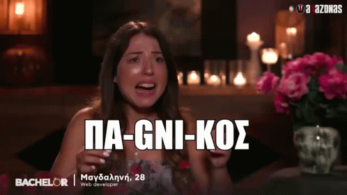 Magdalini from the Greek Bachelor show reacts with an exaggerated expression, exclaiming "Panikos" (Panic) in a dramatic moment.