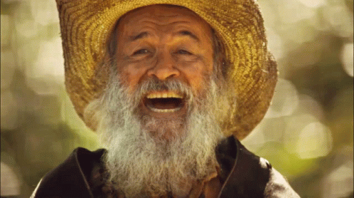 Veio do Rio, the beloved character from Pantanal, laughing heartily in a straw hat.