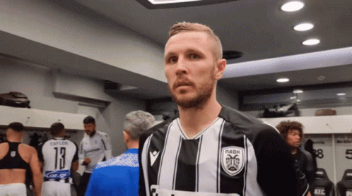 PAOK footballer Jasmin Kurtic in the locker room, wearing his black and white striped team jersey.