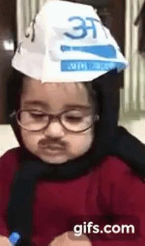 A child dressed as Arvind Kejriwal, wearing glasses and a paper hat with a mustache, holding papers.