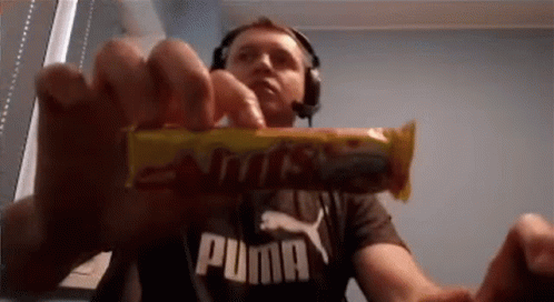 Russian streamer Папич (Arthas) holding up a Snickers bar while wearing headphones.