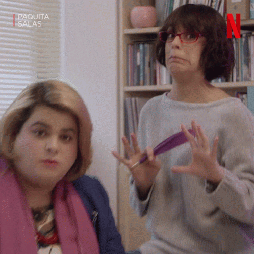 Magüi from Paquita Salas shows a surprised or exasperated expression, holding a purple comb.