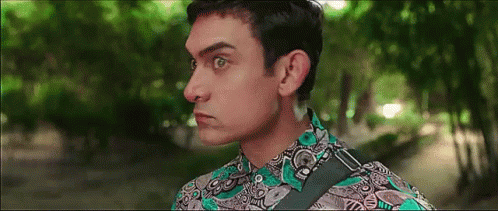 Aamir Khan's iconic wide-eyed, funny expression from the movie PK, showcasing his comedic talent.
