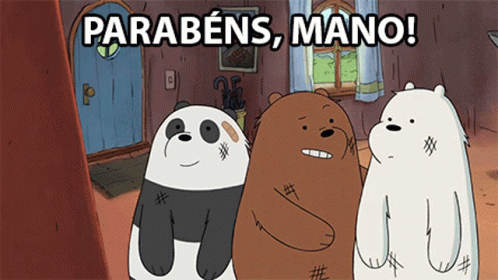 Grizzly, Panda, and Ice Bear from We Bare Bears celebrating with 'Parabéns, Mano!' message.