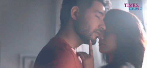 A couple shares an intimate moment, with the man gently kissing the woman's forehead.
