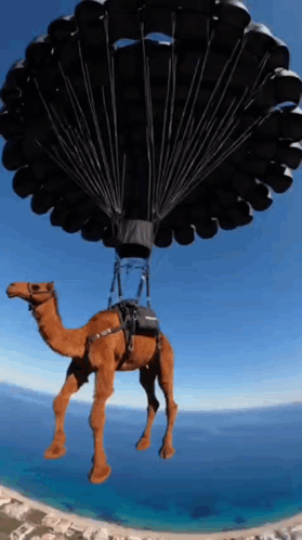 An unusual sight of a camel suspended by a parachute, gracefully descending over a vibrant coastal city and the sparkling ocean.