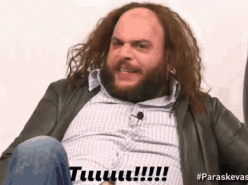παρασκευας κουτσικος, a man with long hair and a beard, shouts 'Tuuuu!!!!!' with a funny expression.