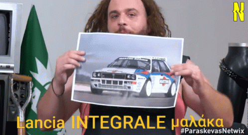 Paraskeuas Labropoulos from Netwix proudly displays a picture of a Lancia Integrale rally car.