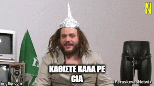 Paraskevas Netwix, wearing a tin foil hat, delivers a message to the CIA.