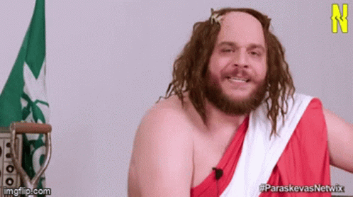 Paraskeyvas Paraskevas, in a toga, expresses 'I am shitting myself' with a panicked look.