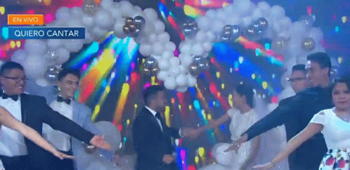Mariano and his happy partner joyfully dance at their wedding, surrounded by guests and festive lights.