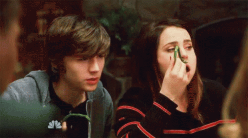 Drew Holt (Miles Heizer) and a girl comically eat green beans at a table in a scene from Parenthood.