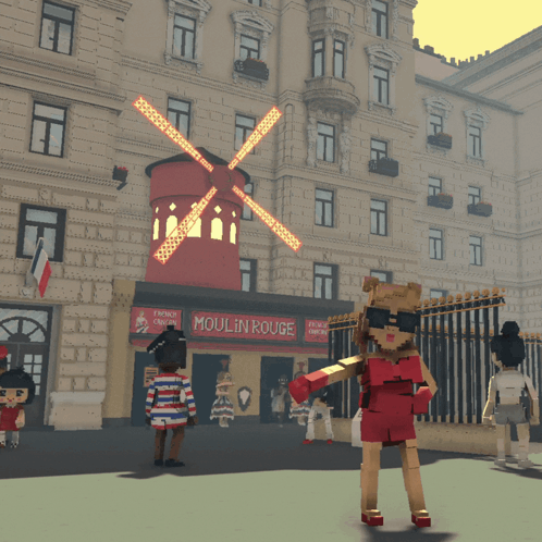 Paris Hilton's voxel avatar says 'bonjour' in front of the iconic Moulin Rouge in Paris, France.