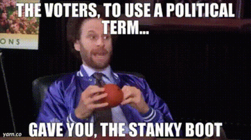 Jeremy Jamm from Parks and Rec delivers a political insult, saying 'The voters gave you the stanky boot.'