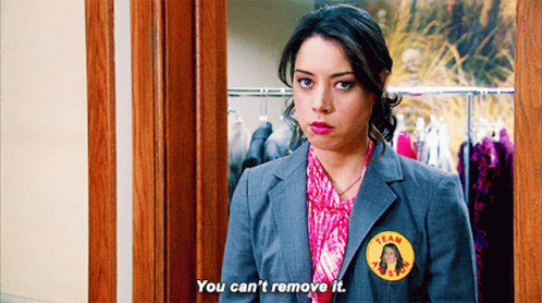 April Ludgate (Aubrey Plaza) from Parks and Recreation with her 'You can't remove it' button.