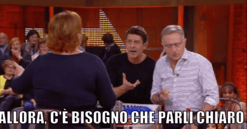 Paolo Bonolis on Avanti Un Altro, animatedly telling someone to 'speak clearly' during a game show moment.