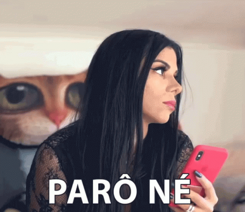 Evelyn Regly holds a phone, giving a serious look with the caption 'Parô Né' and a cat image in the background.