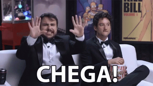 Two men on a couch react with hands up, with the Portuguese word "CHEGA!" (Enough!) displayed.