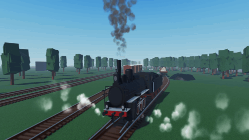 A black steam locomotive travels along tracks, emitting smoke, in a blocky Roblox game environment.