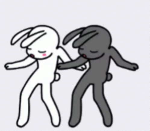 Two cartoon bunnies, one white and one black, happily dancing together, embodying a cheerful party mood.