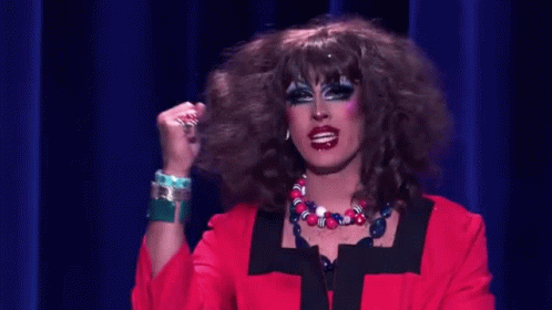 Drag queen Crystal Methyd shows off her 'business in the front, party in the back' look in a red jacket.